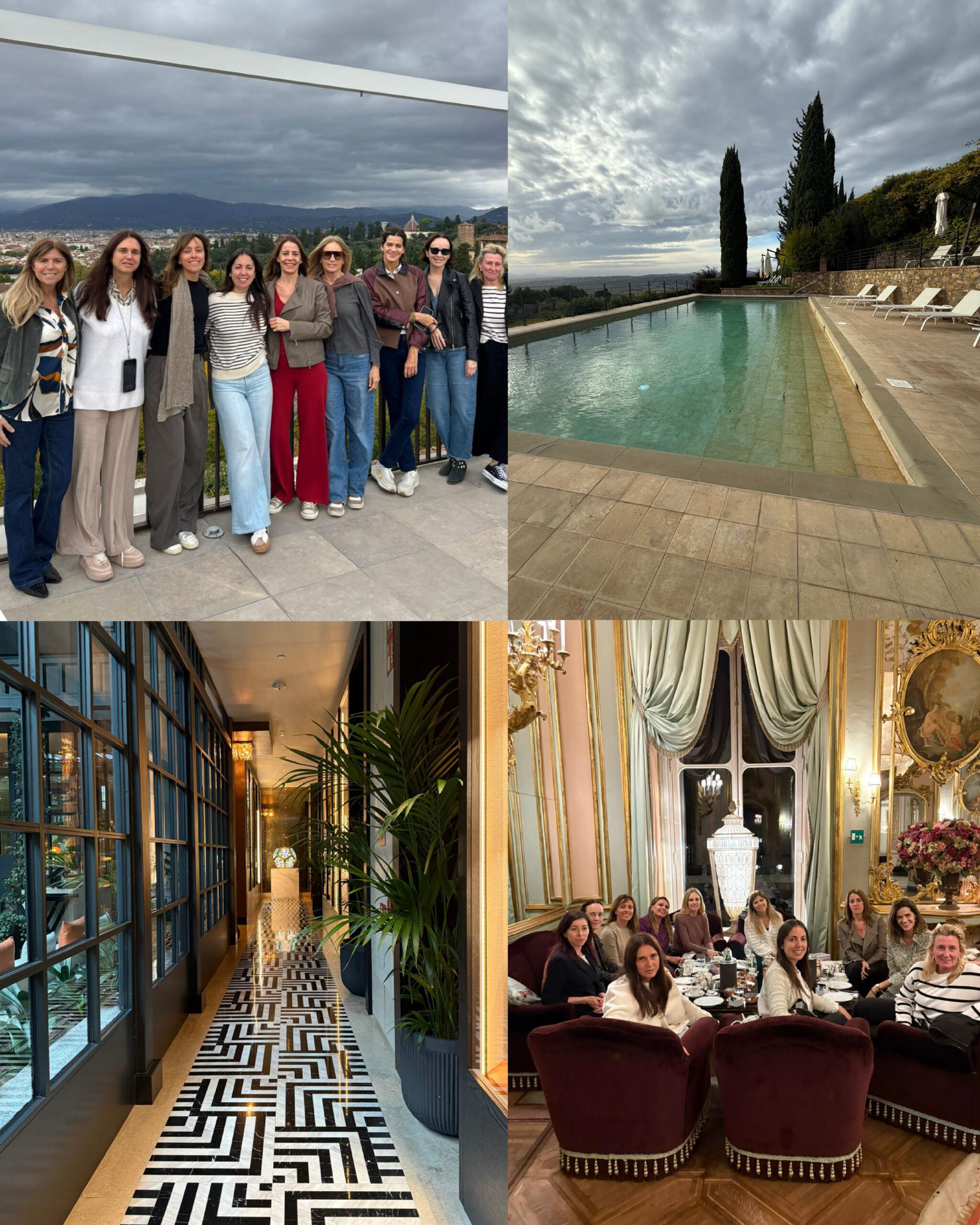 • Villa Cora (Florencia): almuerzo ligero. Actividades incluyeron un walking tour a los Jardines de Boboli y el Palazzo Pitti, visitando los apartamentos reales recién reabiertos , y cenas en Le Bistrot y aperitivos en la ciudad