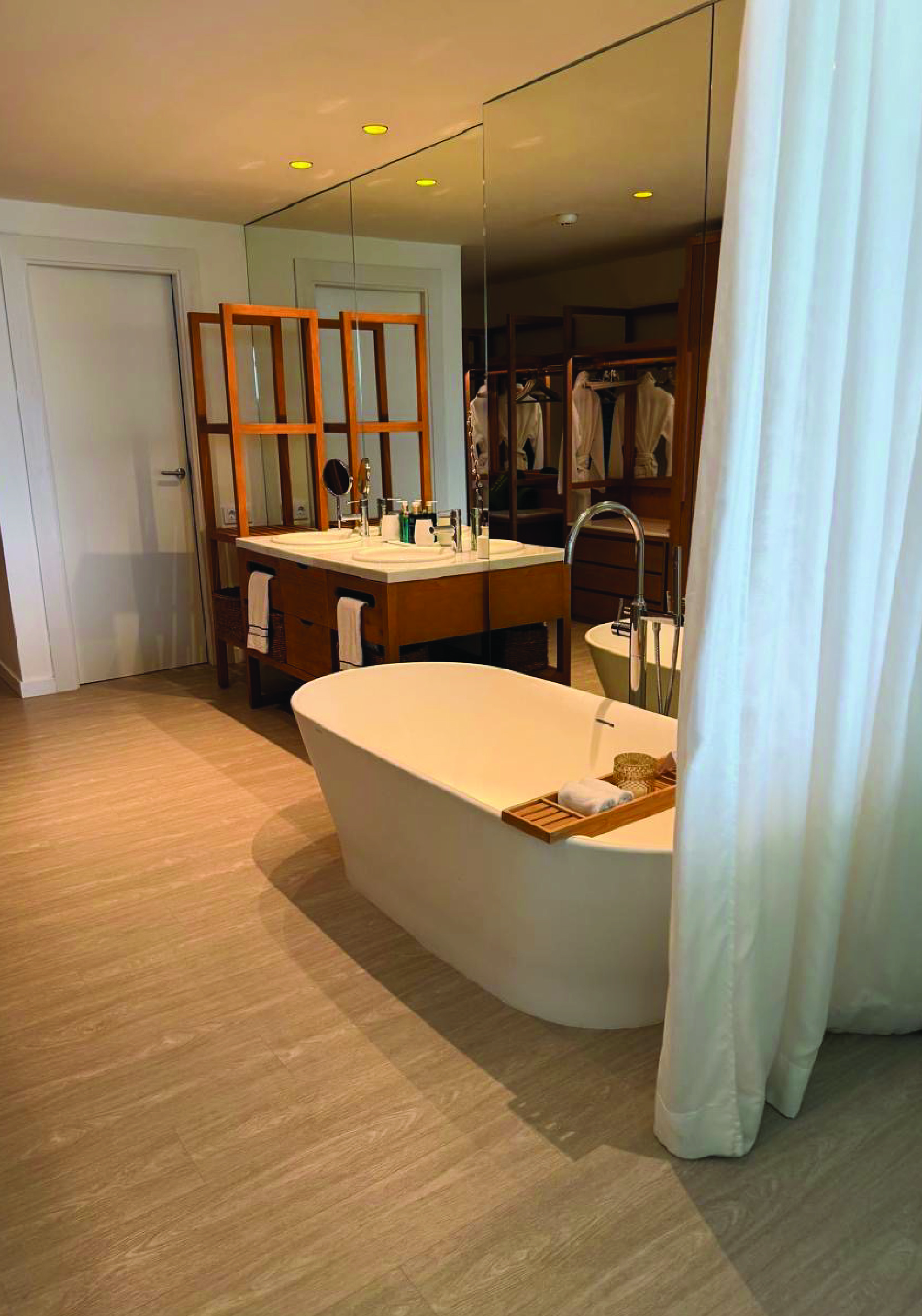 Observan muchos detalles para cuidar el medioambiente, por ejemplo: un reloj de arena que marca los 5 minutos que uno necesita para utilizar el agua de la ducha. Para ir y venir al área de restaurante y recepción se puede caminar por la arena o tienen carritos de golf.