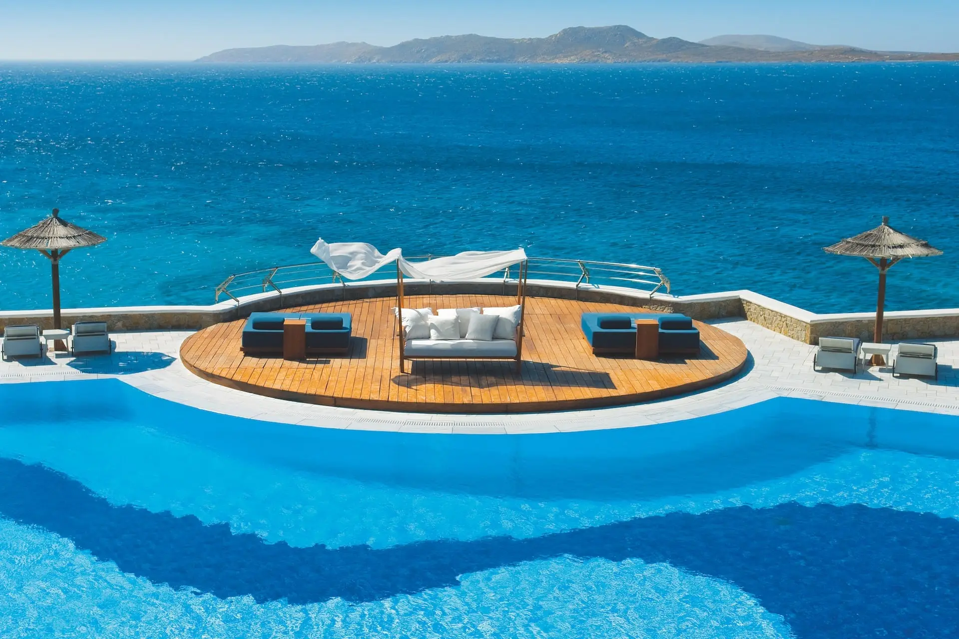 En Mykonos, nuestra elección fue el Mykonos Grand Hotel & Resort (miembro de Small Luxury Hotels). Este refugio es una oda a la estética de las Cícladas: paredes blancas, detalles en azul, cactus y vasijas que recrean una villa típica.