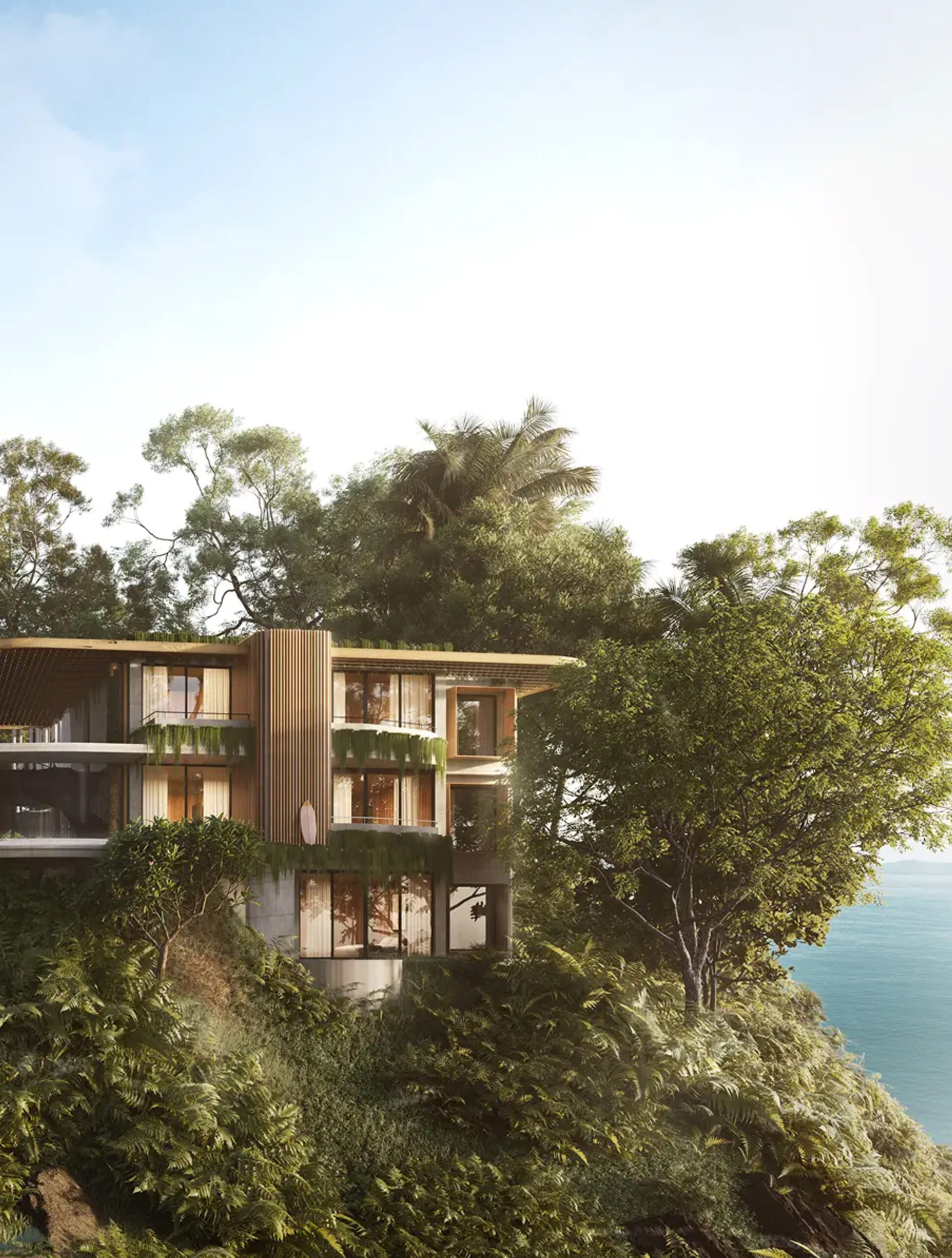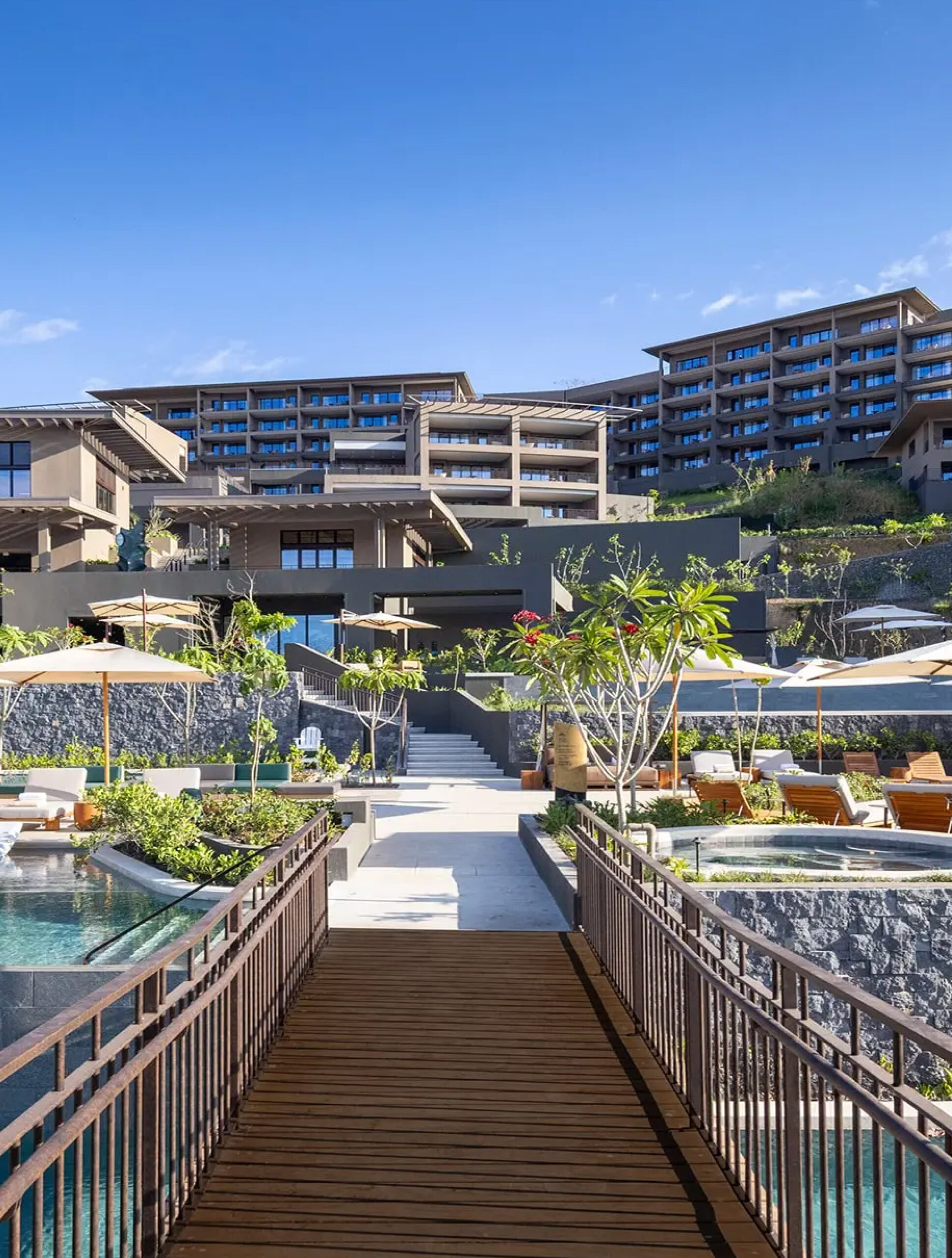 Su arquitectura está fuertemente arraigada en la naturaleza del lugar y la sostenibilidad. El uso de materiales nobles, las terrazas con vistas panorámicas, y un diseño paisajístico con plantas autóctonas hacen que los huéspedes se sumerjan en la belleza natural del entorno. Desde el momento que llegan, recorren un sendero escénico los guía desde la recepción hasta los espacios gastronómicos del “Poblado”, pasando por cascadas, piscinas y terrazas suspendidas que parecen flotar sobre la costa.