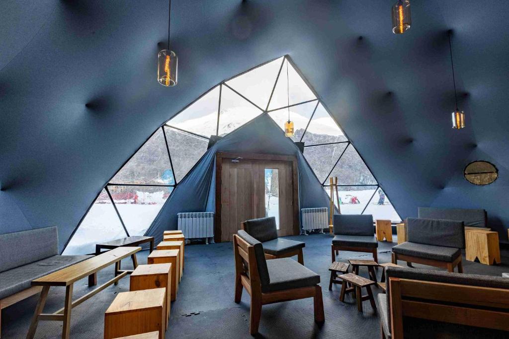 La construcción de piedra y madera de lenga sigue la estética alpina, logrando un equilibrio entre el lujo, la naturaleza y la funcionalidad. Las cabañas —de 2 a 7 personas— están completamente equipadas: cocina, comedor, smart TV, calefacción por loza radiante, hogar a leña y baños con hidromasaje o jacuzzi. Desde los ventanales panorámicos se pueden contemplar la montaña y el bosque nevado, creando un ambiente perfecto para familias o escapadas románticas